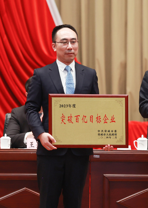 大会对过去一年做出突出贡献的单位及个人进行了表彰,成山集团获评荣成市突破百亿目标企业及纳税30强企业荣誉,成山集团总裁车宝臻、副总裁石富涛代表企业上台领奖。